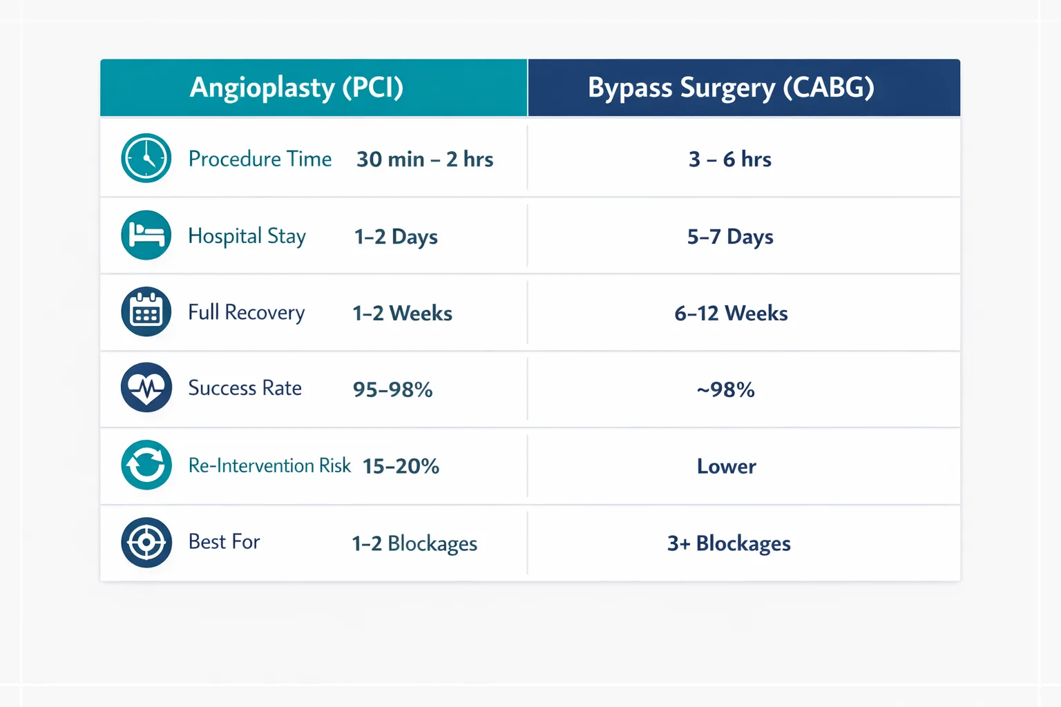 | Best Suited For | Single/double blockages, emergencies, high surgical risk patients | Triple-vessel disease, LAD blockage, diabetic patients |